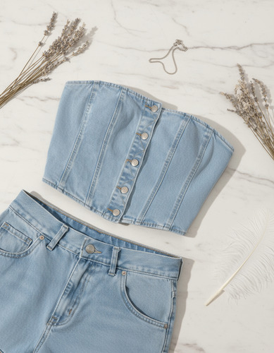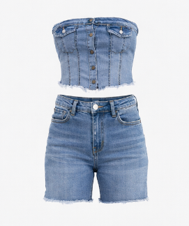 conjunto para dama con pantalón corto en denim y crop top, ideal para un dia fresco, está diseñado para brindar comodidad y estilo fresco; el crop top ofrece un ajuste que resalta la silueta, tiene botones como cierre y dos bolsillos como diseño, y en el pantalón corto su cierre es con botón y cremallera, tiene como diseño incluido dos bolsillos delanteros y traseros, tenemos tallas desde XS, S, M, L, XL.